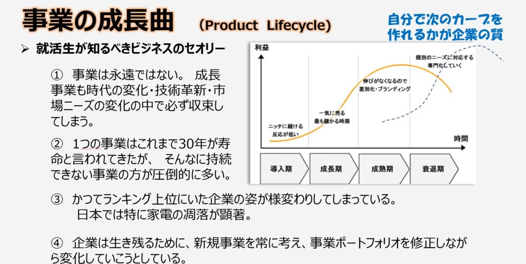 就活準備塾の中でも会社選びの際に留意すべきこととして 「事業は永遠ではない」ということを「事業の成長曲線」という理論を引き合いに出して学生たちにこう話していました。「〇〇の仕事がしたくて会社を選んだところで、時代とともに事業・業容は変わってしまうんですよ。もっと言えば、会社がなくなっていることもたくさん事例がありますよ。」と